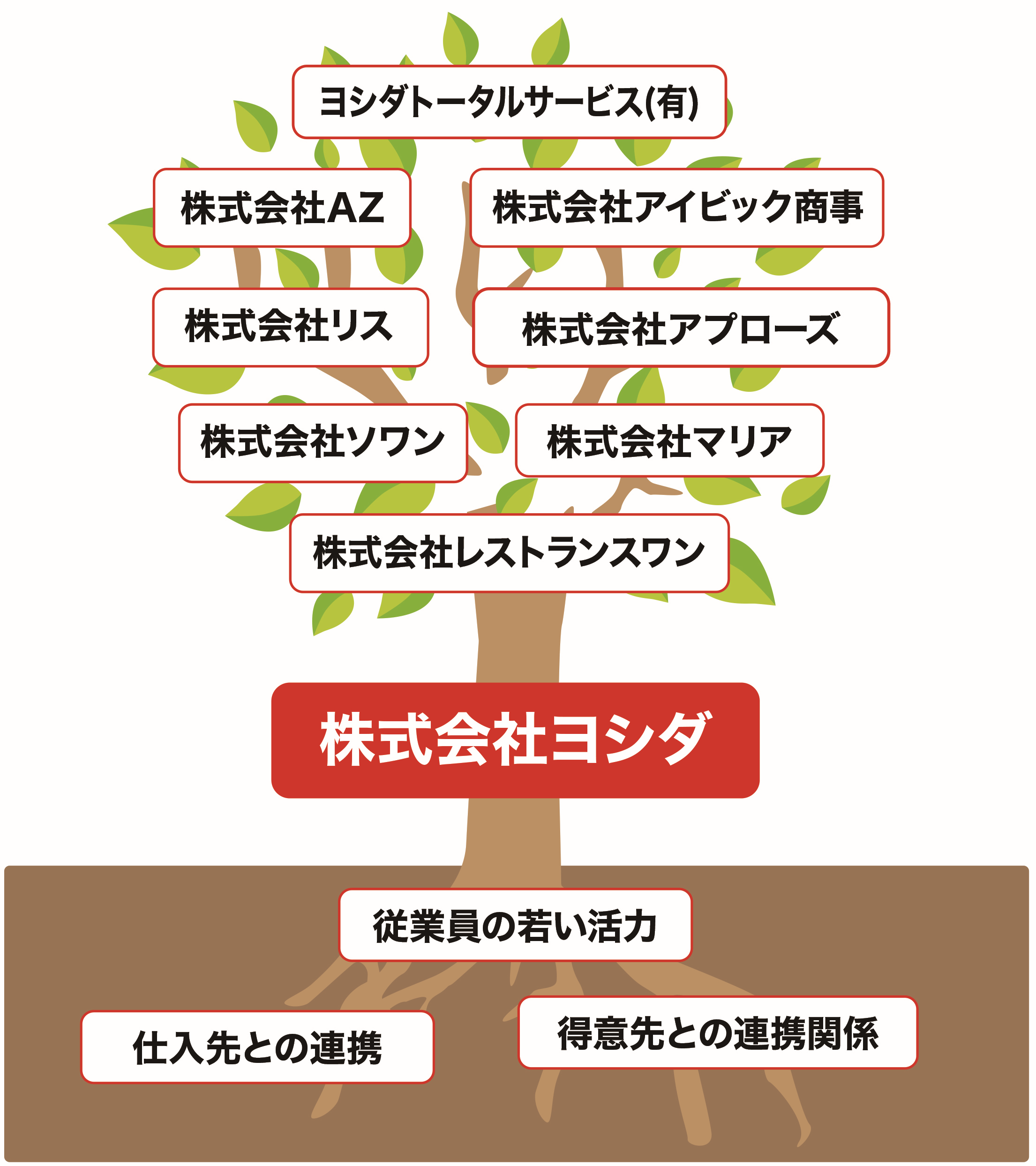 ヨシダグループは、単にギフトという物を提供するのではなく、ギフトをきっかけとした総合商社であり、サービス業です。 これらの営業部や関連会社は、お客様のニーズに応えて、また、取引先とのネットワークとつちかわれたノウハウがあり、社員一同のやる気が融合して成長を続ける樹木です。 そして、これが弊社の最大の強みであると確信します。